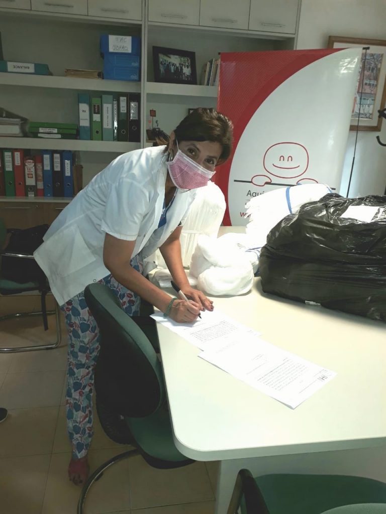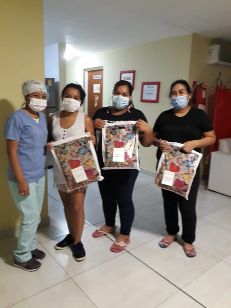 Entrega de 200 kits conformado por bata, cofia y cubre botas al Servicio de Farmacia del Hospital de Niños, recepción realizada por la Jefa de Farmacia Farm. Claudia David.