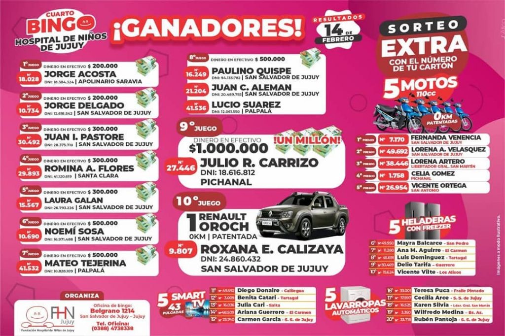 GANADORES del Cuarto Bingo “Fundación Hospital de Niños de Jujuy”