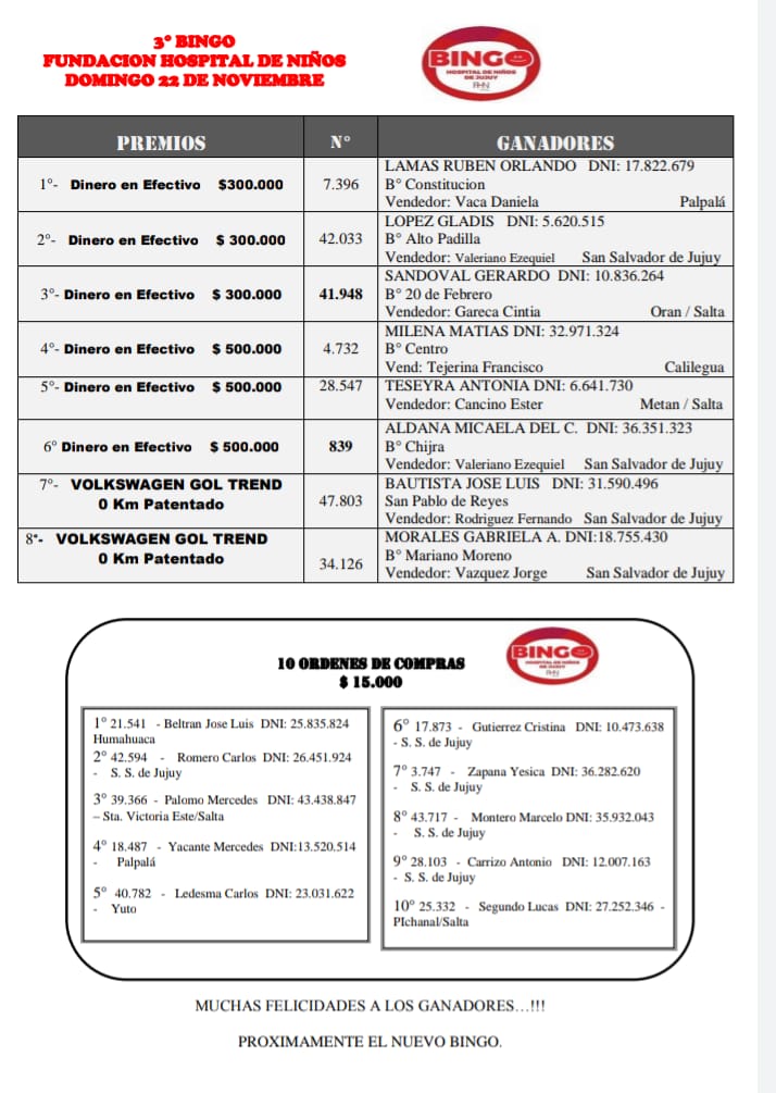 GANADORES del tercer Bingo “Fundación Hospital de Niños de Jujuy”